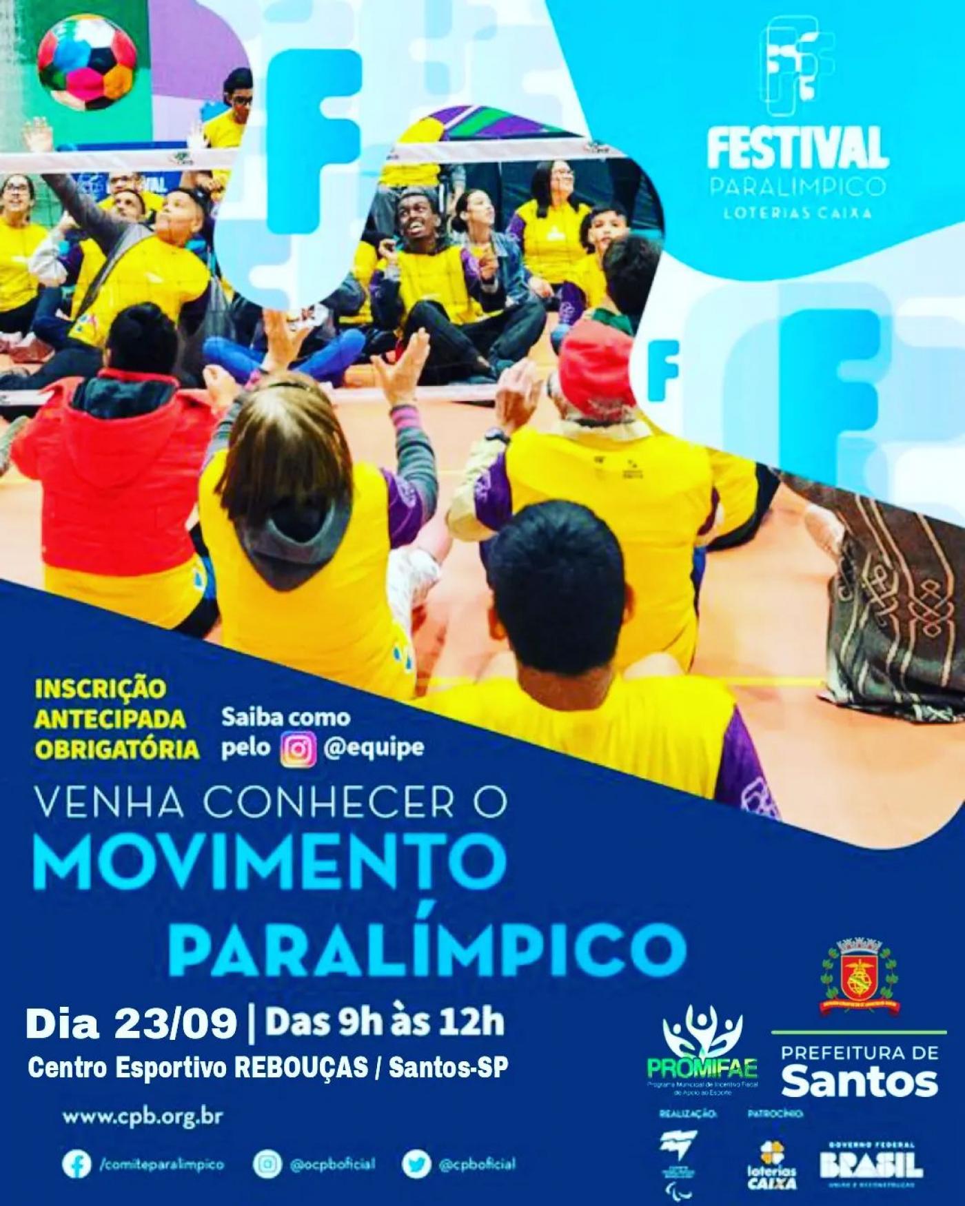 Já estão abertas e vão até a próxima sexta-feira (22) as inscrições para a 2ª Edição do Festival Paralímpico Santista, que acontece no Dia do Atleta Paralímpico, 23 de setembro, das 9h às 12h, no Centro Esportivo e Recreativo (CER) Rebouças, na Ponta da Praia. das 9h às 12h.