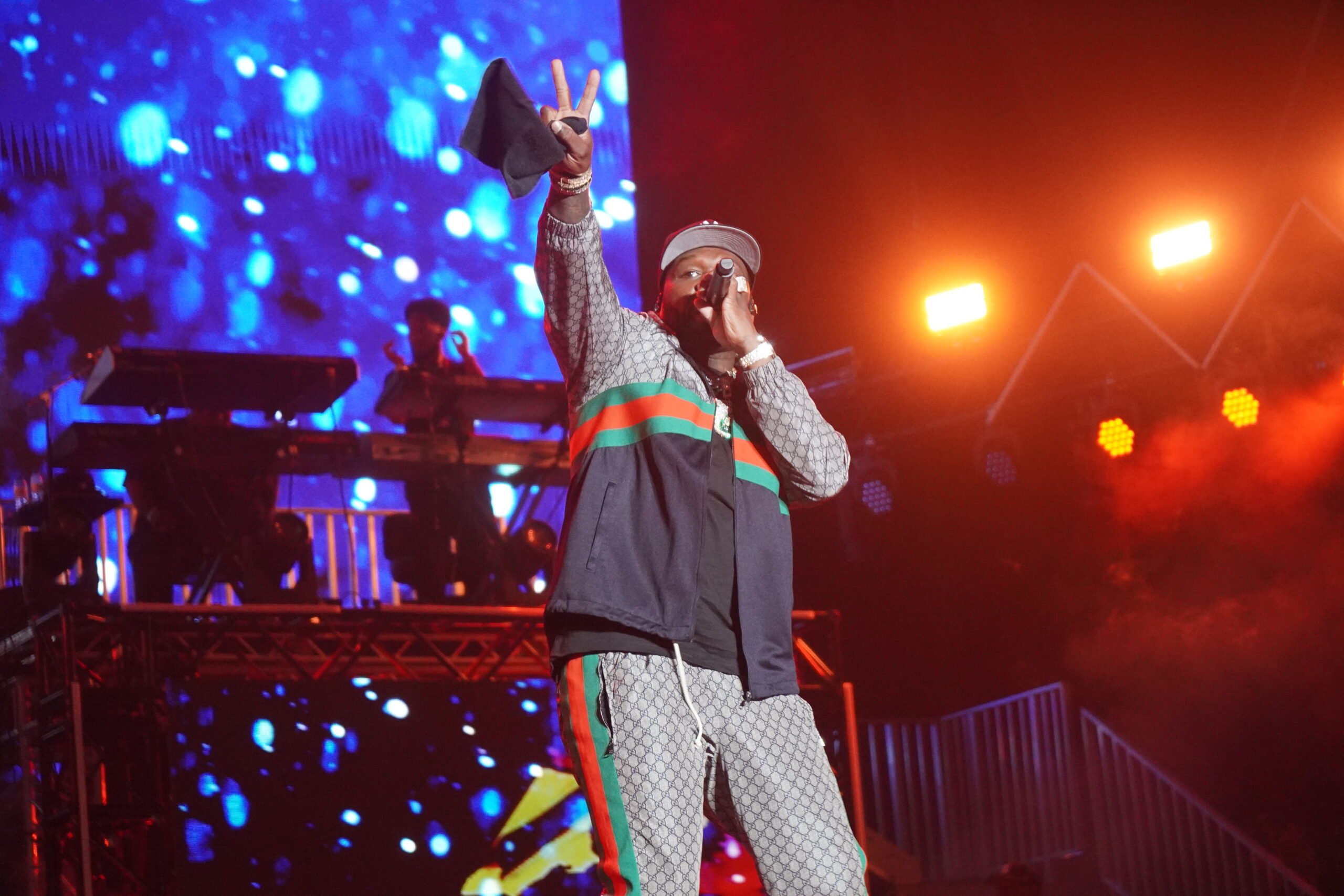 Aproximava-se a hora da sua atuação e os espaços que estavam vazios em frente ao palco principal foram rapidamente preenchidos, por um número elevado de pessoas. As luzes apagaram-se, no ecrã passavam imagens da trajetória do rapper, dos seus filmes e séries. E nas colunas, “This is 50 Cent” ouvimos (isto é 50 Cent). O gigante entrou em palco com “Magic Stick” acompanhado de dois elementos do seu grupo, G-Unit.