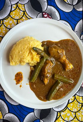 Pisar o sal, dois alhos e o louro num almofariz, juntar-lhe o sumo de limão e envolver a marinada nos pedaços de galinha. Numa panela, refogar a cebola, um alho e a polpa de dendém num fio de óleo de palma. Juntar o tomate e deixar apurar. Depois, junta-se o frango, deixa-se alourar e acrescenta-se água. Tempera-se a gosto. Quando o frango estiver cozido juntar os quiabos e deixar ferver durante cinco minutos. Acompanha com funje de mandioca ou milho.