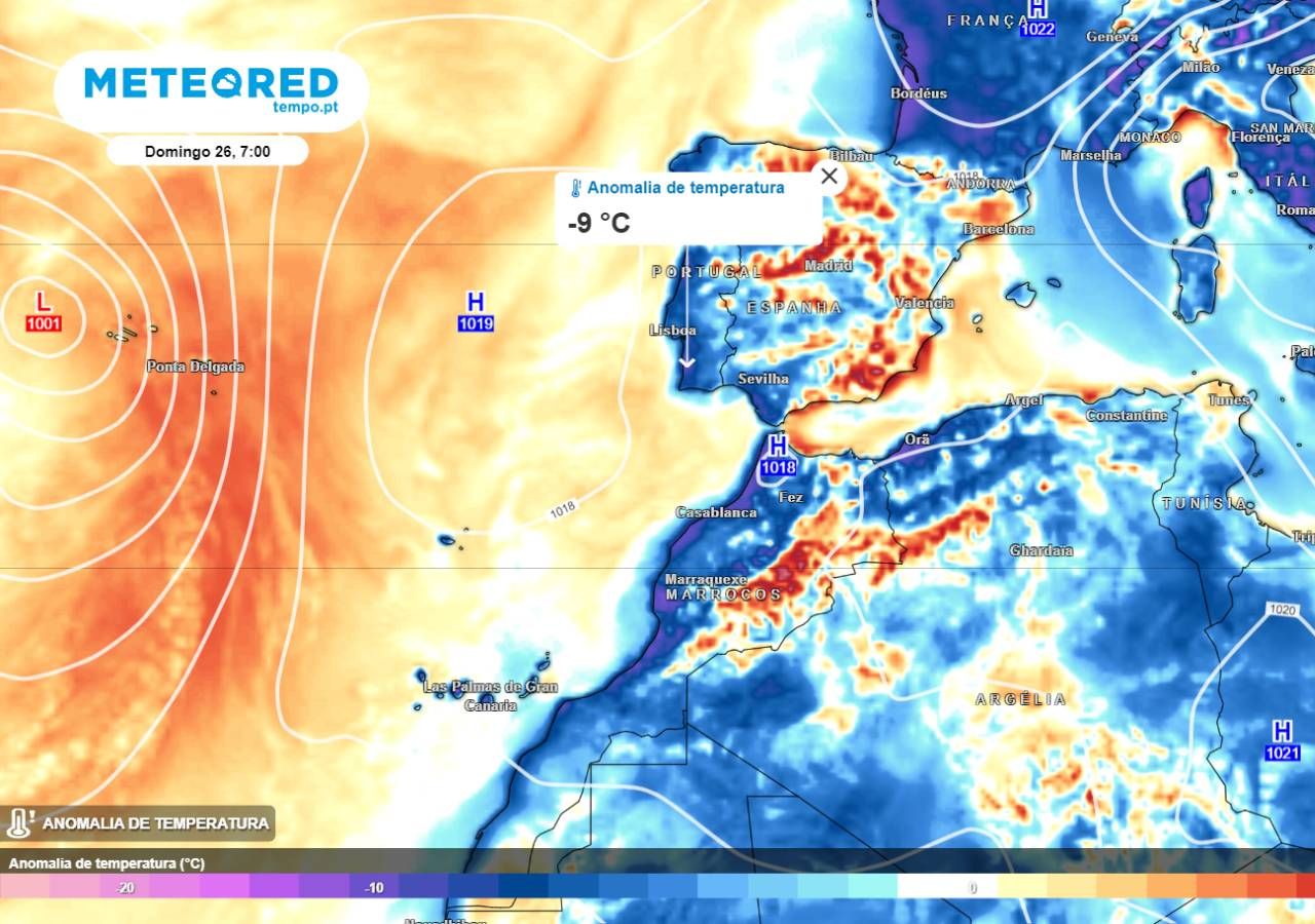 Para a próxima semana, nas zonas do litoral, prevê-se menos frio à noite graças à possível mudança de padrão meteorológico que se começa a desenhar nos mapas: ventos de oeste e provável regresso da precipitação, o que resultaria numa recuperação das temperaturas, além do efeito de proximidade ao mar que produz um efeito termorregulador.