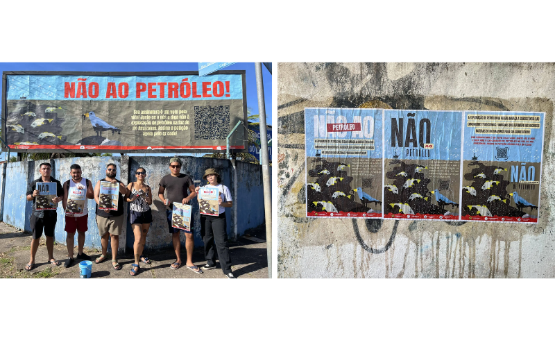 Ativistas colam cartazes contra a exploração de petróleo na Foz do Amazonas em Macapá. (Foto: Brunna Silva | ((o))eco).