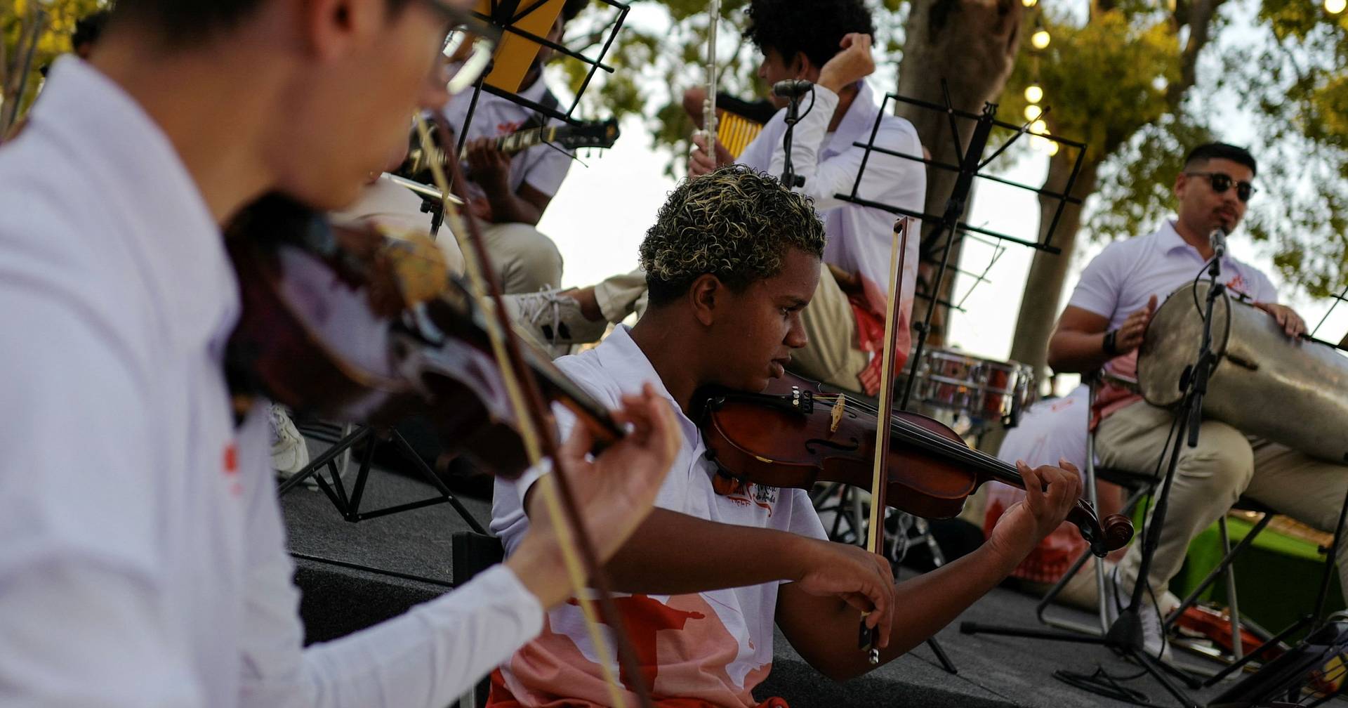 Caue Santos e Ana Sousa, dois jovens que integram a “Maré do Amanhã” e atuaram em São Pedro de Alcântara, explicam à Reuters o privilégio em integrar uma orquestra que “salvou muitas pessoas” e permite concretizar sonhos e dar uma oportunidade a jovens que vivem em condições muito complicadas.