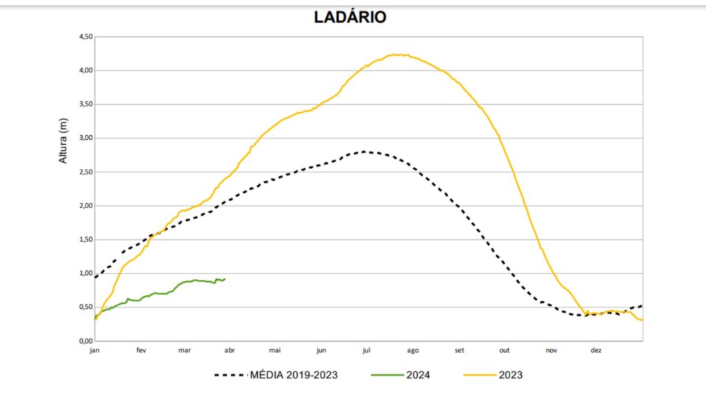 Em 2024, o nível máximo anual do rio Paraguai deve ocorrer entre o final de maio e começo de junho, com a cota variando em torno de 1,50 m. Em relação à cota mínima anual, espera-se que atinja cotas negativas na régua de Ladário ao final do período de vazante, semelhante ao que ocorreu em 2020 (-0,32 m).